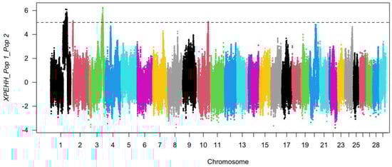 Additionally, we used the XP-EHH analysis, a robust cross-population statistic, to determine the selection process. It uses extended haplotype homozygosity (EHH) statistics based on specific fixed alleles inside each population [29], and we used the rehh package [30] to calculate that measure. The parameter used to consider the signature of selection was XP-EHH value ≥ 5 (p < 0.01) in the groups.