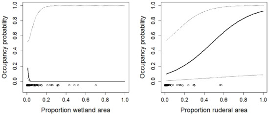 The effects of the proportion of the area within a site covered with wetland vegetation and ruderal vegetation within a site on the occupancy probability of Alytes obstetricans. The dotted lines show the 95% confidence interval. Circles indicate observed values of the explanatory variable. Other explanatory variables in the model were fixed either at their median or the mean values, depending on the skewness of the distribution. The relationship is for sites where the species was known to occur in the past (i.e., the occupancy probability can be interpreted as a persistence probability).