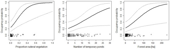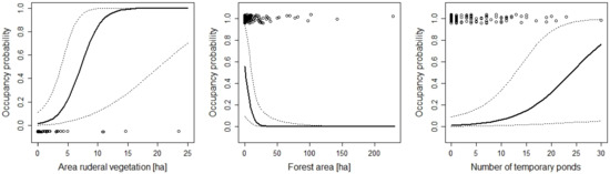 The effect of the area of ruderal vegetation, number of temporary ponds, and forest area on the occupancy probability of Epidalea calamita. For additional explanations, see the caption of Figure 2.