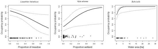 The effects of habitat characteristics on the occupancy probability of Lissotriton helveticus, Hyla arborea, and Bufo bufo. For additional explanations, see the caption of Figure 2.