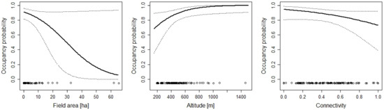 The effect of the area of fields, altitude, and connectivity on the occupancy probability of Ichthyosaura alpestris. For additional explanations, see the caption of Figure 2.