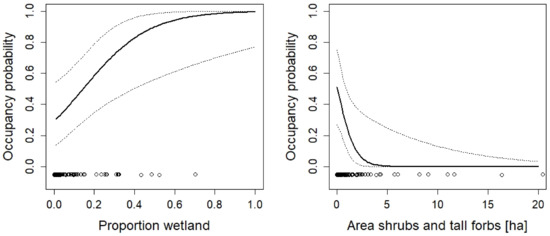 The effect of the proportion of wetlands and the area of shrubs and tall forbs on the occupancy probability of Lissotriton vulgaris. For additional explanations, see the caption of Figure 2.
