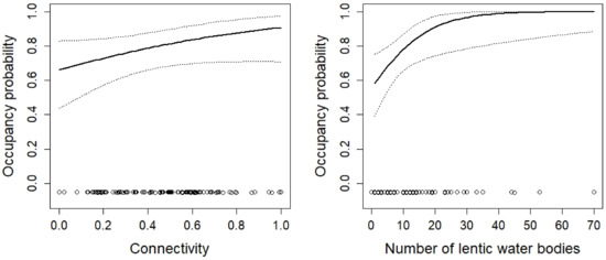 The effect of connectivity and the number of lentic water bodies on the occupancy probability of Pelophylax frogs. For additional explanations, see the caption of Figure 2.