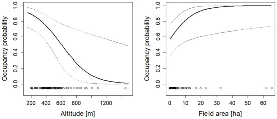 The effect of altitude and the area of fields on the occupancy probability of Rana dalmatina. For additional explanations, see the caption of Figure 2. The effect of connectivity is not shown because the confidence intervals widely overlap zero.