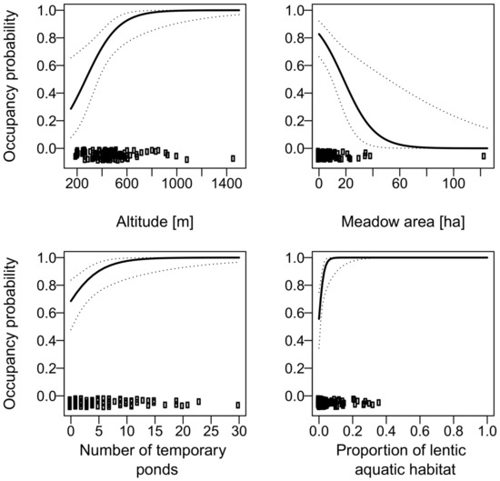 The effect of altitude, number of temporary ponds, proportion of freshwater habitat, and the area of meadows on the occupancy probability of Rana temporaria. For additional explanations, see the caption of Figure 2, but note that the explanatory variable “past presence” was not included in the final model.