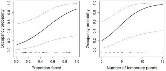 The effect of the proportion of forest and the number of temporary ponds on the occupancy probability of Triturus carnifex. For additional explanations, see the caption of Figure 2.