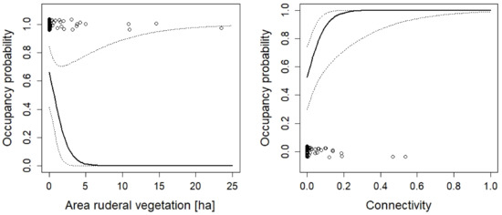 The effect of connectivity and the area of ruderal vegetation on the occupancy probability of Triturus cristatus. For additional explanations, see the caption of Figure 2.