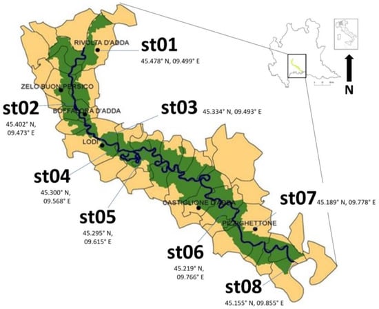 The River Adda, with a total length of 313 km and a mean flow rate of 187 m3/s, is the longest tributary of the river Po (the major Italian river) and the fourth longest Italian river. It rises in the Alps near the border with Switzerland and flows through the densely populated and highly anthropized region of Lombardy (Northern Italy) (Figure 1).