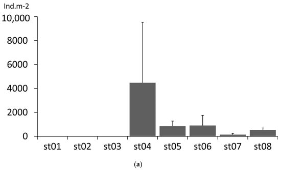 Dikerogammarus villosus was mainly present in the downstream part of the River Adda, especially in the sampling site st04 (4473 ± 5053 ind.m−2), where a single ovigerous female was also found (Figure 2a). The population density was higher where the water current was less strong, and the bottom was mainly composed of finer-sized grains (Table 1).