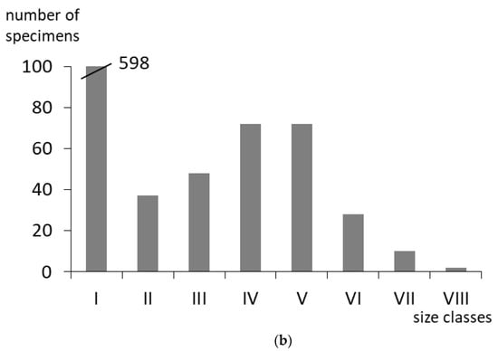 Moreover, the size classes analysis indicated that the majority of specimens were in the first size class (3–6 mm) or in the fourth (12.01–15 mm) and fifth (15.01–18 mm) size classes (Figure 2b).