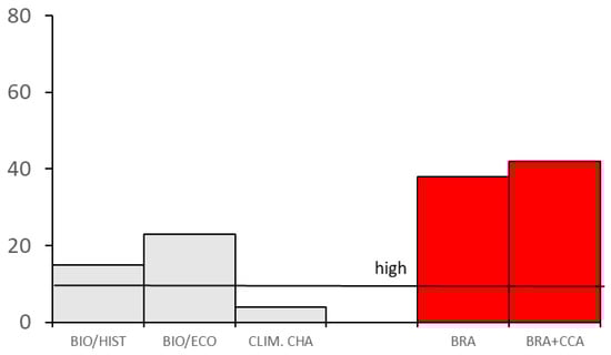 Score partition (in grey), BRA and BRA + CCA scores (in red) obtained applying AS-ISK for the evaluation of the invasiveness of D. villosus. BIO/HIST: Biogeography/Historical; BIO/ECO: Biology/Ecology; CLIM. CHA: Climate Change; BRA: Basic Risk Assessment; CCA: Climate Change Assessment. The colour red indicates a high level of invasiveness; the continuous line indicates the threshold between high/low level of invasiveness proposed by AS-ISK [].