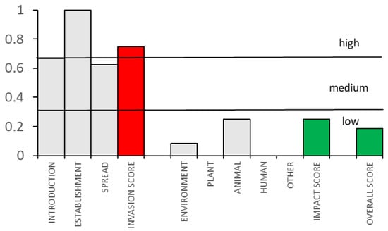 A score > 1 indicates that an alien species may become invasive, causing medium or high risks, on the contrary, a score < 1 indicates that the alien species could not be considered invasive, and it is classified as “low risk”.