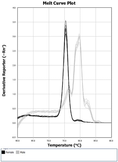 DNeasy Blood and Tissue kits (QIAGEN, Germantown, MD, USA) were used to extract DNA from dried lake sturgeon fin clips, according to the manufacturer’s protocols. The real-time PCR reactions contained 18 µL of master mix (10 µL of 2X Forget-Me-Not™ EvaGreen qPCR Master Mix-Low ROX (Biotium, Fremont, CA, USA), 1 µL each of the AllWSex2 forward and reverse primers at 10 pmol/µL, and 6 µL of diH2O) and 2 µL of DNA at a concentration of 20 ng/µL for a total volume of 20 µL. The negative control reactions (NTCs) contained 2 µL of sterile dH2O instead of DNA. Thermal cycling was carried out on a QuantStudio™ 6 (Applied Biosystems, Waltham, MA, USA) and included the following settings: melt curve experiment, SYBR® Green reagents, fast cycling conditions, including PCR, and a 20 µL reaction volume. The cycling parameters were as follows: an initial denaturation step of 2 min at 95 °C, followed by 40 cycles of 5 s at 95 °C, 10 s at 56 °C, and 20 s at 72 °C, with imaging during the extension step. This was followed by 15 s at 95 °C and melt curve analysis from 56 to 95 °C with 0.1 °C increments, a 3-s hold at each temperature, and imaging. The resulting melt curve and fluorescence derivative plots were evaluated using the QuantStudio™ Real-Time PCR Software v1.2 (Applied Biosystems, Waltham, MA, USA). We produced an R-script for summarizing the maximum rate of change in the fluorescence within the temperature ranges corresponding to the male- and female-specific PCR products and produced a linear discriminant model for sex assignment using these summary statistics using the lda function from the R package MASS ([13]; https://github.com/ScribnerLab/LakeSturgeon_SexID; DOI:10.5281/zenodo7072409, accessed on 28 August 2022).
