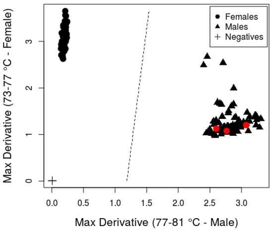Maximum derivative of the fluorescence for the males, females, and negative controls within the male (77–81 °C) and female (73–77 °C) peak regions. These two summary statistics can be used to easily determine the genotypic sex of the individuals. The symbols correspond to the sex that was assigned to each individual in the field. The dashed line corresponds to the proposed linear discriminant function for differentiating the females (left of the line) and the males (right of the line) based on the rates of change in the fluorescence. The three individuals that were field-identified as females but classified as males by the melt curve assay are delineated by red dots in the lower right-hand corner.