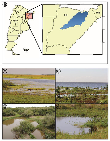 (a) Map of Argentina showing the Iberá Depression in the Corrientes province. (b) Photo of a typical wetland of the Iberá Depression (San Nicolás, Corrientes), (c) Photo of Laguna Iberá (Corrientes), (d) Photo of a typical wetland of Pay Ubre (Corrientes), (e) Photo of a typical wetland within Mburucuyá (Corrientes). CO: Corrientes province, MIS: Misiones province.