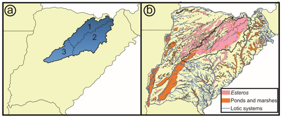 The Iberá Depression contains a complex of wetlands of about 14,000 km2 with permanent or semi-permanent water, with different types of aquatic vegetation, all of which make the region one of the largest macro-wetlands in the world. It is located in the upper basin of the Corriente River and drains into the Paraná River. The Iberá Depression can be divided into three sub-basins: Iberá, Carambolas and Naciente del Río Corriente [21], each of them with particular dynamics (Figure 2a).