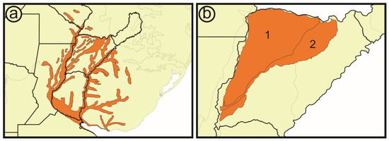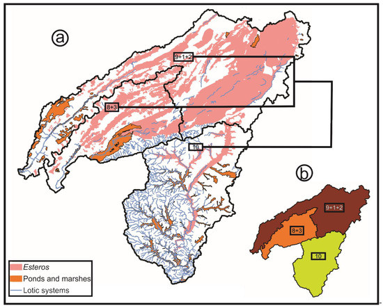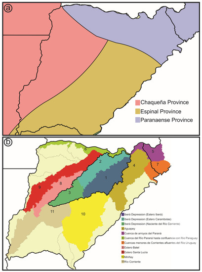 The term Iberá has also been used in different regionalization schemes due to its environmental complexity. Therefore, the geographical extent of Iberá strictly depends on how it is defined. Morrone et al. [22] have referred to the Esteros del Iberá province (Figure 3a) which is similar to the Riverine district, as defined by Apodaca et al. [23], they have referred to Iberá as a vast area covering the flood valleys of the Paraguay–Parana fluvial axis, from north-eastern Argentina and southern Paraguay to the Parana Delta, and the Uruguay River from southern Brazil to the Rio de la Plata.