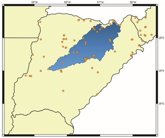 Maps were prepared with the free software Quantum Gis 3.24 [29] and the shapefiles were downloaded from the IGN (Instituto Geográfico Nacional, https://www.ign.gob.ar, accessed on 1 August 2022), whereas the basins were downloaded from HydroSHEDS website (https://www.hydrosheds.org, accessed on 1 April 2022) and modified according to the limits proposed in the Atlas de Cuencas y Regiones Hídricas Superficiales de la República Argentina [21].