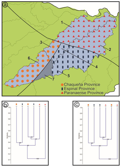 - Biogeographic provinces sensu Cabrera and Willink [17]: This scheme proposes a hierarchical partition, which is a divisive, non-agglomerative classification of the regions into domains, provinces, and districts. In this categorization, the successive levels mainly based on the phytogeographic hierarchy, from domain to district, are carried out by the presence of endemisms and predominance of families and species [18,24]. The vegetation of the Neotropical and Subantarctic sectors of Argentina is then classified into 12 provinces [24], three of them are represented in the area: Espinal, Chaqueña and Paranaense (Figure 4a).