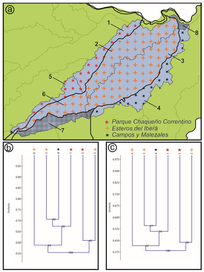 (a) Iberá Depression divided by the ecoregions, (b) Dendrogram showing similarity between areas (Sorensen–Dice), (c) Dendrogram showing similarity between areas (Jaccard). The dendrograms showed a CC > 0.96.