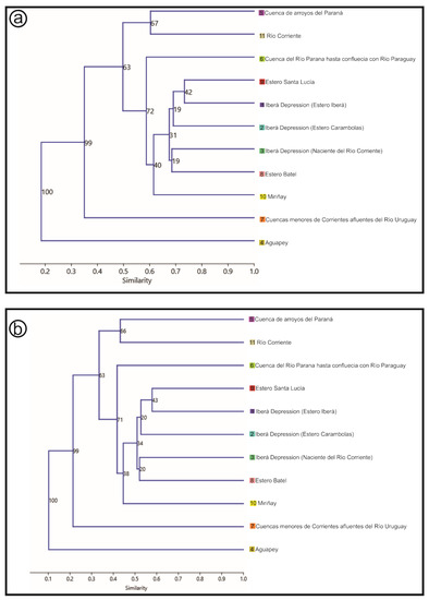 The analysis between the Iberá Depression and the external basins shows (according to the Jaccard and Sorencen–Dice indexes) two main groups. The Iberá Depression sub-basins show less similarity among them than with the external basins (Figure 8a,b). In this regard, two main clusters were found: Iberá and Carambolas grouped together with Santa Lucía ((9-1)2) and the group conformed by the Batel and Naciente del Río Corriente group (8-3) with Miriñay (10) as a “sister” group of both of them.