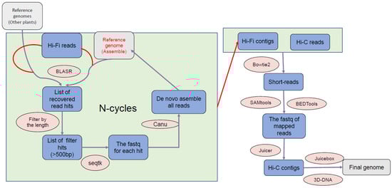 Camellia spp. mitochondrial genomes are harder to assemble than chloroplast genomes due to their large size and high repetitive rate []. Compared to dozens of published chloroplast genomes [], only the mitochondrial genome of C. sinensis was assembled []. Utilizing long-read genome sequencing allows mitochondrial genome assembly to achieve high-sequence contiguity as well as high-scaffold contiguity []. Here, we used a combination of sequencing technologies, including PacBio Hi-Fi and Hi-C, to assemble the mitochondrial genome for C. gigantocarpa, and present workflows for the accurate and complete assembly of the large and complex plant mitochondrial genome with highly repetitive sequences (Figure 1).