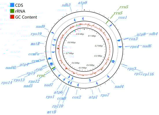 The circular mitochondrial genome of C. gigantocarpa was 970,410 bp in length (GenBank: OP270590) and a GC content of 45%, and it contained 44 protein-coding genes and 22 non-coding genes (Figure 2). The protein-coding genes of mitochondrial genome of C. gigantocarpa included 15 NADH dehydrogenase genes (nad1–nad7, nad4L, nad9; there are three copies of nad1, nad2, and nad5), two succinate dehydrogenase genes (sdh3 and sdh4), one cytochrome c reductase gene (cob), three cytochrome c oxidase genes (cox1–cox3), five ATP synthase synthesis genes (atp1, atp4, atp6, atp8, and atp9), four cytochrome c biogenesis genes (ccmB, ccmC, ccmFC, and ccmFn), one maturase gene (matR), one transporter gene (mttB), and 12 ribosomal protein genes (rpl10, rpl16, rpl2, rpl5, rps1, rps3,rps4, rps7, rps12–rps14, and rps19). The non-coding genes of mitochondrial genome of C. gigantocarpa include three rRNA genes (rrn5, rrn18, and rrn26) and 19 tRNA genes that transferred 16 amino acids. In comparison to the mitochondrial genome of C. sinensis (GenBank: OM809792.1), the mitochondrial genome of C. sinensis contained 47 protein-coding genes and 33 non-coding genes, which was more than C. gigantocarpa, but two protein-coding genes (rpl2, and rps3) were exclusively found in the mitochondrial genome of C. gigantocarpa (Table S2).