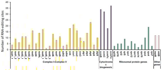 In mitochondria, RNA editing is common. A single base can modify a codon, which, in turn, alters an amino acid, and changes the content, structure, or function of the protein. RNA editing frequently results in the unintentional addition of a stop codon, which prevents the protein from being fully translated, making the protein non-functional []. Our results show that all 44 protein-coding genes had RNA edits, all of which were C-U transitions. All 483 C-U RNA editing sites were unevenly distributed among different genes, ranging from 1 (nad5) to 37 (ccmFn) (Figure 3). There were four cases of RNA editing, of atp6, atp9, cox2, and rpl16, in which the results were stop codons. The amino acid characteristics were modified by 55% RNA editing, such as switching from hydrophilic to hydrophobic amino acids (Table S5).