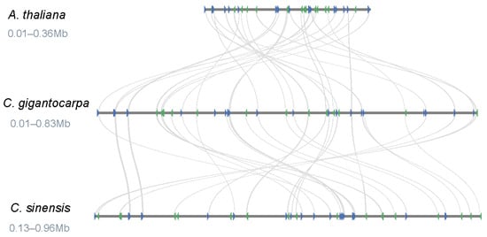 In higher plants, the gene order of chloroplast genomes is often highly conserved, especially among closely related species. Although the genes contained in the mitochondrial genomes of higher plants are largely conserved, the size, structure, and gene order of mitochondrial genomes are highly variable []. Gene-order comparisons frequently reflect the high rate of mitochondrial genome rearrangement between plant species. According to this study, C. gigantocarpa has fewer protein-coding genes with the same gene order as A. thalian than C. sinensis (Figure 4) indicating that the discovered gene order is less conserved when compared to more distantly related species. Despite usually slow rates of sequence evolution, plant mitochondrial genomes develop rapidly in terms of genome rearrangement []. Our work showed high-sequence homology and abundant genomic rearrangement between the C. gigantocarpa and C. sinensis mitochondrial genomes (Figure 5).