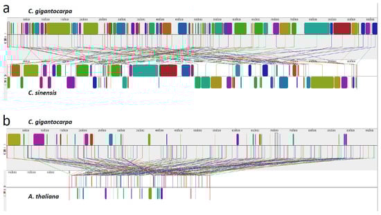 Whole mitochondrial alignments of three species. (a) Whole mitochondrial alignments of C. gigantocarpa and C. sinensis; and (b) whole mitochondrial alignments of C. gigantocarpa and A. thaliana.
