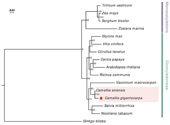 Mitochondrial genomes contain valuable information that can be used for understanding the evolution of these mitochondria. We built ML trees for 12 protein sequences shared by 16 plant mitochondrial genomes (Table S1) and found that C. gigantocarpa was grouped with C. sinensis with 100% bootstrap support, which means the protein-coding genes are conserved despite the high rate of recombination in the mitochondrial gene order in the genus Camellia (Figure 6).