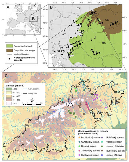 Cordulegaster heros was described by Theischinger [1] with type locality in Austria, Lower Austria-Sankt Andrä vor dem Hagnethale in central Europe. The species is found on the Balkan Peninsula (including Greece, North Macedonia, Montenegro, Albania, Croatia, Slovenia, Serbia, Bosnia and Herzegovina, Bulgaria, northeastern Italy, and Romania) and central Europe, including the foothills of the Alps in eastern Austria [2,3,4,5], the foothills of the Carpathians Mountains in Slovakia [6,7], the Czech Republic [8], and outside of the Carpathians Mountains in Ukraine [9]. Separate areas of growth have been reported from the hills in the middle of the Pannonian lowland in Hungary [10,11].