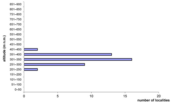 Number of localities with Cordulegaster heros populations in the Czech Republic based on altitude (all authors (n = 42)).