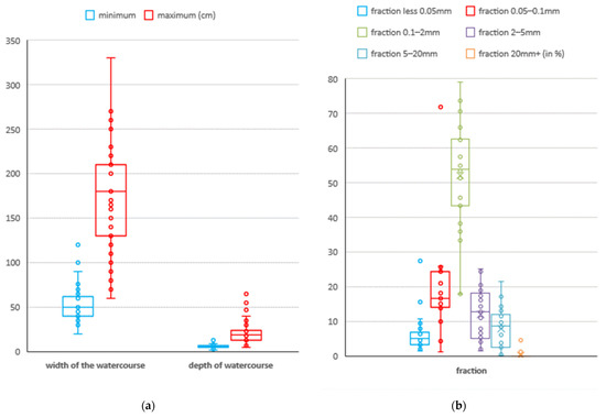 Characteristics of habitat at localities with Cordulegaster heros larvae (n = 42): (a) width and depth of watercourses, (b) grain composition of the sediment.