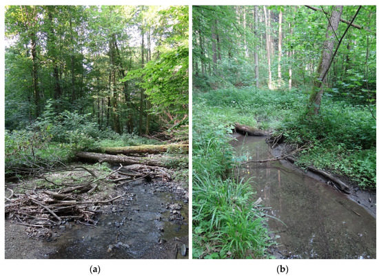 The vegetation is most frequently composed of the following species listed in order of frequency of occurrence: Aegopodium podagraria, Athyrium filix-femina, Carex remota, C. sylvatica, Dryopteris filix-mas, Geranium robertianum, Glechoma hederacea, Impatiens noli tangere, Lamium maculatum, Urtica dioica, Stachys sylvatica, Petasites albus, Pulmonaria officinalis, Rubus fruticosus, R. hirtus, Carex brizoides, Brachypodium sylvaticum, Carex pendula, Lycopus europaeus, Lysimachia numularia, Mercurialis perennis, Oxalis acetosella, Impatiens parviflora, and others. All localities are located in the forest complex of Chřiby Hills (Figure 4a,b). The alluvia are covered by forest stands characterized by the following two types of composition: 1. Alnus glutinosa and Fraxinus excelsior with an admixture of Fagus sylvatica and Acer pseudoplatanus, and 2. dominated by Fagus sylvatica and Acer pseudoplatanus with an admixture of Carpinus betulus and Alnus glutinosa. Individually, Tilia cordata, Quercus petraea, Sambucus nigra, nonnative Picea excelsa, and Larix decidua may also be represented.