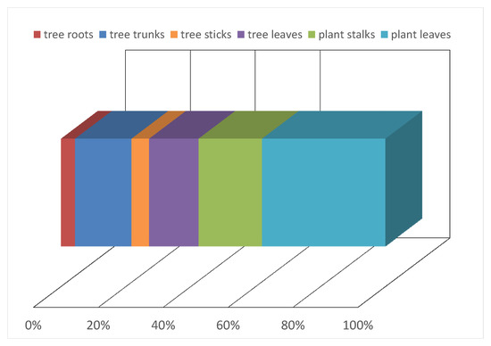 The emergence period occurred from 28 May (the earliest date of detection of exuviae in 2014) to 1 July (the latest date of detection of exuviae in 2013). A total of 186 exuviae were found (several exuviae were in varying degrees of damage, such as the abdomen or head were missing). The site of emergence was evaluated with respect to location, i.e., the place where the adult emerged: (a) tree roots (exposed roots of living trees in the vertical banks of the streams), (b) tree trunks, (c) tree sticks, (d) tree leaves, (e) plant stalks, and (f) plant leaves (Figure 5). The presence of these emergence places is based on the characteristics of the habitat that the species inhabits, namely, watercourses shaded with rich vegetation and tree layers. Plant leaves were the dominant site of emergence (57%, Figure 5) followed by plant stalks (21%) and tree trunks (17%), tree leaves (15%), tree sticks (5%), and tree roots (4%) (Figure 6a,b). Even the roots of old trees, which were uncovered and formed “overhangs” from the soil due to water erosion, were selected by larvae for emergence. It is obvious that the larva at the end of its “journey” climbed as if on the ceiling and continued horizontally on the overhanging root.