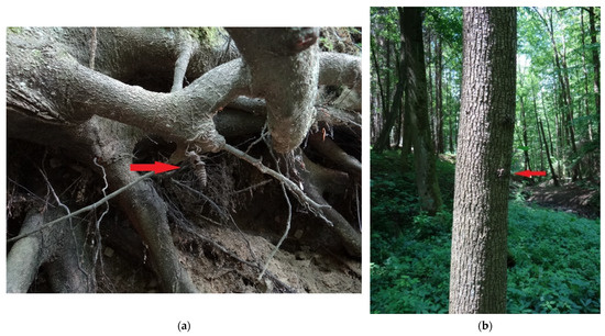 Position of exuviae of Cordulegaster heros: (a) on tree roots at steep bank, locality Cvrčovický potok stream (Cvrčovice cadastral territory, southern Czech Republic) (locality Ie), (4 June 2016, photo by Otakar Holuša); (b) on trunk of Alnus glutinosa, locality Cvrčovický potok stream (Cvrčovice cadastral territory, southern Czech Republic) (locality Ie), (8 July 2016, photo by Otakar Holuša).