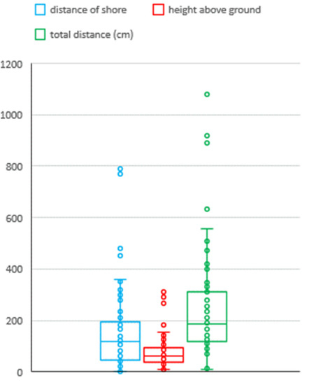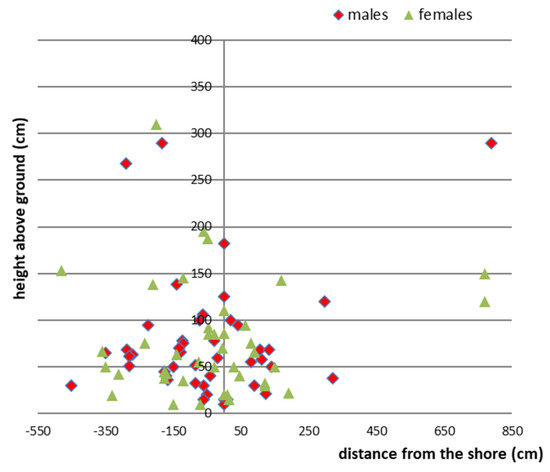 Emergence sites were located at different distances from the shoreline and at different heights. Specifically, exuviae were noted from 0 to 790 cm (ẍ = 154 cm) at a horizontal distance from the shore and from 10 to 310 cm (ẍ = 77 cm) at a vertical height above the ground. The total distance of larval movement ranged from 10 to 1080 cm (ẍ = 205 cm) (Figure 7 and Figure 8).