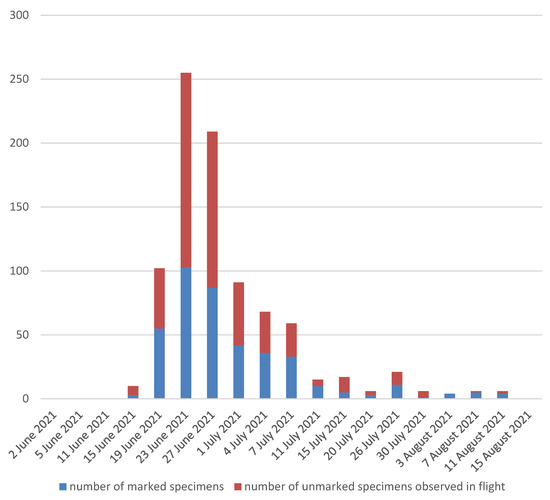 In 2021, the flight period of the adults at the Habešský potok stream (locality VIf) stream site was studied in detail. The flight activity of adults was monitored from 2 June to 18 August 2021. The site was monitored in suitable weather (partly cloudy to clear sky, midday temperature, approximately 20 °C or greater) from 8:30 a.m. to 7 p.m. CET from 2 to 15 June, from 15 July to 18 August 2021 (sunrise on these days at this latitude is at 4:55 and 5:20 a.m. EST, respectively), and from 5:30 a.m. to 9:15 p.m. CET from 19 June to 11 July 2021 (sunrise on these days at this latitude ranges from 4:50 to 5:05 a.m. CET). The passing adult was caught on the first pass and marked with a number on the wings. On the next overflight, only the number was detected, and the overflight was noted. The total number of adults within a day and the passage of non-marked adults were recorded. The number of adults observed each day was determined based on the number of marked individuals and the number of passes of unmarked individuals.