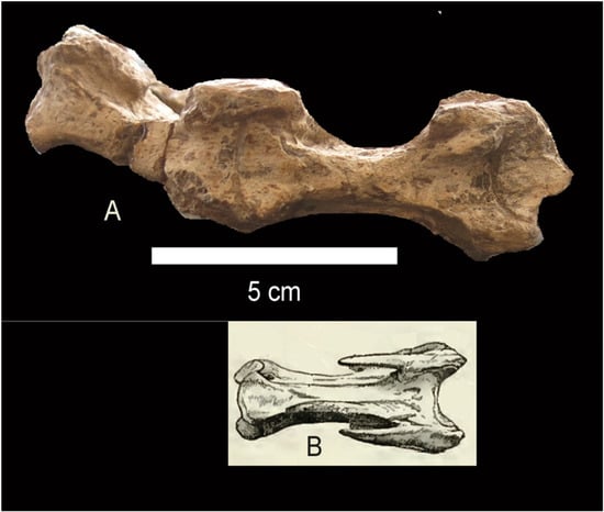 It is worth noting that, according to Davies [3], the above-mentioned distal end of a right tibiotarsus (NHMUK PV OR 39732; Figure 4) possibly belonged to the same individual as the group of bones constituting the type specimen of Struthio asiaticus. Lydekker [6,9] accepted the identification as S. asiaticus.The type of fossilisation is indeed very similar; however, the label accompanying NHMUK PV OR 39732, indicates that it was collected and presented by P.J. Cautley (in 1842 according to Lydekker [6]), which suggests that its origin is different from that of the type specimen presented by J. Colvin in 1848. As noted by Davies [3], this bone is very similar to the corresponding element in Struthio camelus in its morphology and measurements. Lydekker ([9], p. 144) found it “indistinguishable in all respects from the tibia of S. camelus”.