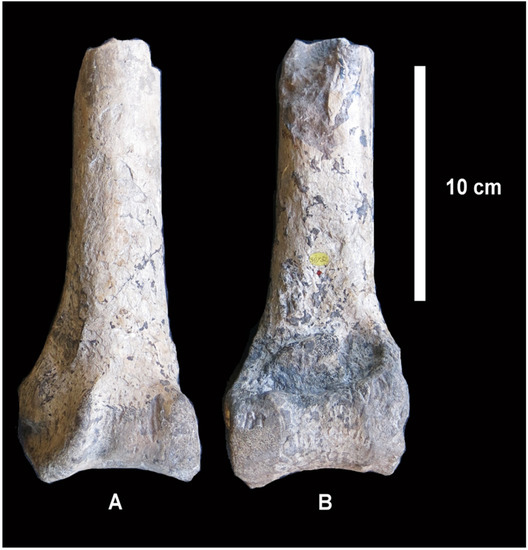 Distal part of the right tibiotarsus of an ostrich, from the “Siwalik hills, India” (exact locality and stratigraphic position unknown), collected and donated by P.J. Cautley, NHMUK PV OR 39732, in caudal (A) and cranial (B) views. Specimen referred to Struthio asiaticus by Davies [3] and Lydekker [9]. Contrary to Davies’s opinion, it is unlikely to belong to the same individual as the type specimen of S. indicus, which was collected by J. Colvin. Since the type specimen of Struthio asiaticus does not include a tibiotarsus, this specimen may be referred to as Struthio cf. asiaticus.