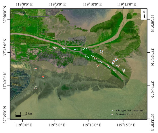 The study area is located in the Yellow River Delta Wetland Nature Reserve in Shandong Province (37°35′ N–38°12′ N, 118°33′ E–119°20′ E) (Figure 1). The Yellow River Delta is the largest estuarine delta nature reserve in China. It is a representative example of estuarine wetland ecosystems worldwide and has been included in the list of internationally important wetlands by the Ramsar Convention [34]. The terrain of this area is flat, with an altitude of 2.0–15.0 m. The total research area is approximately 2902 km2, and the land use types mainly include cultivated land, wetlands, and saline-alkali land [35]. The Yellow River Delta belongs to a warm, temperate, semi-humid, continental monsoon climate zone, with significant temperature differences between the four seasons. The annual average temperature is 11.7–12.6 °C, the extreme maximum temperature is 41.9 °C, and the extreme minimum temperature is −23.3 °C; the frost-free period is 211 d, and the average annual rainfall is 530–630 mm [36].