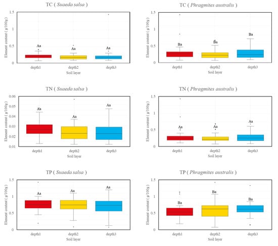 Total carbon (TC), total nitrogen (TN), and total phosphorus (TP) contents of the inter-root soils of two plants, S. salsa and P. australis (depth 1 = 0–20 cm, depth 2 = 20–40 cm, and depth 3 = 40–60 cm). Notes: different capital letters (A, B) represent significant differences in the soil elements under the different vegetation types, and lowercase letters (a) represent nosignificant differences in the soil elements in the different soil layers of the same vegetation type.