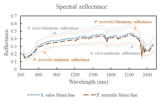 The spectral reflectance curves of all soil samples under the two vegetation types in the wavelength range of 350–2500 nm are shown in Figure 3, where the general trends of the measured spectral reflectance curves of the soil samples under the different vegetation types are the same. The soil spectra under both vegetation types showed distinct soil spectral absorption peaks near 1400, 1750, and 2300 nm, but the depths and areas of the absorption peaks were different. Comparing the spectral reflectance curves of S. salsa and P. australis, the reflectance curves of P. australis soils were more concentrated, indicating that the structural components of the P. australis root soils were relatively stable.