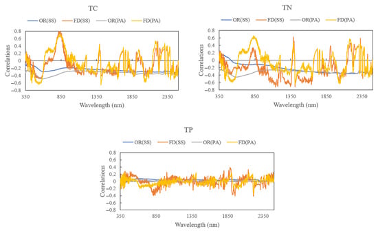 Correlation between the original reflectance (OR) and first derivative reflectance (FD) of P. australis (PA) and S. salsa (SS) and the soil total carbon (TC), total nitrogen (TN), and total phosphorus (TP) contents.