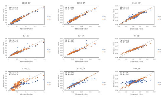 Modelling results of the carbon, nitrogen, and phosphorus levels in inverted wetland soils using three models: partial least-squares regression (PLSR), random forest (RF), and support vector machine (SVM). OR: original reflectance; FD: first derivative reflectance.