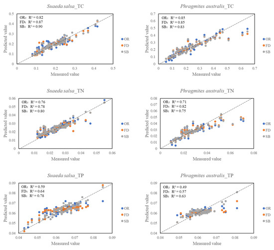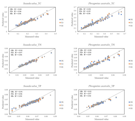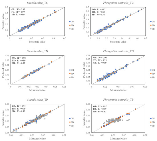 The P. australis and S. salsa sample data were mixed and then divided into sample and validation sets. Prediction models based on the original spectral reflectance and first derivative spectral reflectance data were established using PLSR, RF, and SVM models. Comparing the models obtained using these three methods (Figure 5) revealed that the modelling accuracies of the PLSR and RF were relatively higher than that of the SVM. Additionally, the R2 values of the PLSR models were >0.82, with most values being >0.90. However, the modelling accuracy of SVM was relatively low. Except for the R2 of the TN prediction model based on first derivative processing, which reached 0.99, the other R2 values were <0.80. The prediction model based on the first derivative processing of the spectral reflectance was significantly more accurate than the prediction model based on the original spectral reflectance data, except for the SVM models for TC and TN.