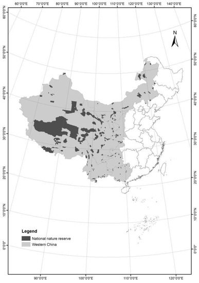 The study area (80°25′–123°11′ E, 21°14′–52°8′ N) was located in western China, including 144 national nature reserves in Shaanxi Province, Gansu Province, Ningxia Hui Autonomous Region, Xinjiang Uygur Autonomous Region, Inner Mongolia Autonomous Region, Sichuan Province, Chongqing Municipality, Guizhou Province, Yunnan Province, Guangxi Zhuang Autonomous Region, Qinghai Province, and Tibet Autonomous Region. The total area was 875,498.35 km2, accounting for 13.01% of the total area of western China (Figure 1).
