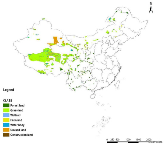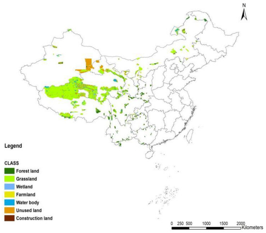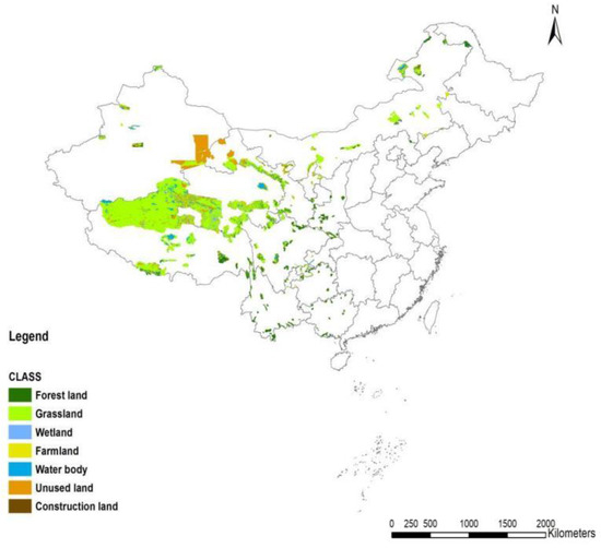 Since the implementation of the full-scale development policy targeting the western region, grassland has dominated the land use in the national nature reserves in western China, accounting for more than 3/5 of the total area, followed by unused land and forest land, accounting for more than 1/6 of the total area (Figure 2, Figure 3 and Figure 4 and Table 3).