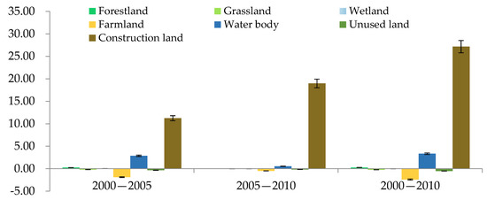 In 2000–2005, the areas of forestland, wetland, water bodies, and construction land increased by 0.25%, 0.03%, 2.79%, and 10.10%, respectively, while the areas of grassland, farmland, and unused land decreased by 0.21%, 1.92%, and 0.34%, respectively. In 2005–2010, the areas of forestland, water body, and construction land increased by 0.02%, 0.55%, and 18.97%, respectively, while the areas of grassland, wetland, farmland, and unused land decreased by 0.03%, 0.03%, 0.48%, and 0.17%, respectively. Furthermore, over the period of 2000–2010, the areas of forestland, water body, and construction land continued to increase by 0.27%, 3.33%, and 27.15%, respectively, while the areas of grassland, farmland, and unused land continued to decrease by 0.24%, 2.42%, and 0.51%, respectively.
